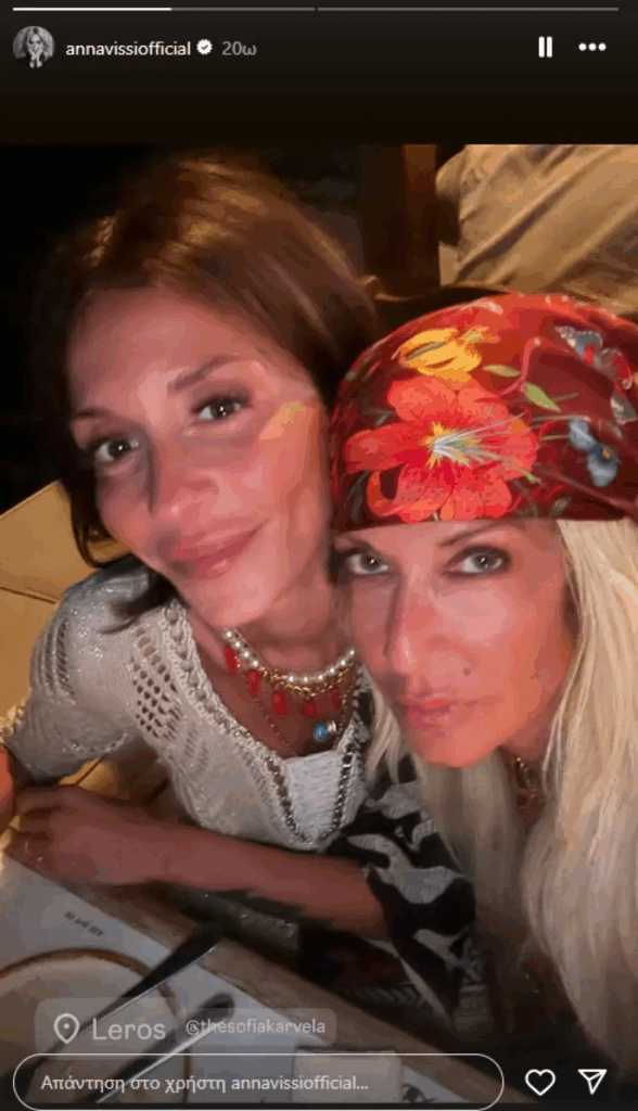 Στη Λέρο κάνει διακοπές η Άννα Βίσση μαζί με την κόρη της, Σοφία Καρβέλα.Η τραγουδίστρια έκανε γνωστό ότι βρίσκεται στο νησί των Δωδεκανήσων, με μία ανάρτησή της την Κυριακή 17 Αυγούστου, στον προσωπικό της λογαριασμό στο Instagram.Στο στιγμιότυπο που μοιράστηκε με τους ακολούθους της, η Άννα Βίσση πόζαρε μαζί τη σχεδιάστρια μόδας, με τις δύο να κοιτούν τον φακό χαμογελαστές, την ώρα που απολάμβαναν το δείπνο τους.