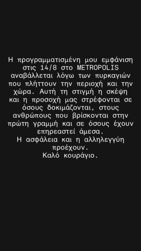 «Η προγραμματισμένη μου εμφάνιση στις 14/8 στο METROPOLIS αναβάλλεται λόγω των πυρκαγιών που πλήττουν την περιοχή και τη χώρα. Σε αυτή τη δύσκολη στιγμή, η σκέψη και η προσοχή μας στρέφονται σε όσους δοκιμάζονται, στους ανθρώπους που βρίσκονται στην πρώτη γραμμή και σε όσους έχουν επηρεαστεί άμεσα. Η ασφάλεια και η αλληλεγγύη προέχουν. Καλό κουράγιο σε όλους.»