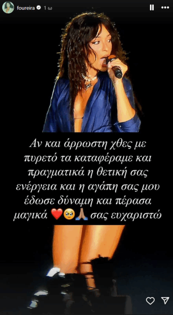 Η Ελένη Φουρέιρα έδωσε και φέτος το «παρών» στην Ημέρα Θετικής Ενεργείας για να γιορτάσει τα είκοσι χρόνια της διοργάνωσης. Αν και άρρωστη, η τραγουδίστρια ανέβηκε στη σκηνή και ξεσήκωσε το κοινό επί είκοσι λεπτά με γνωστά κομμάτια της.Φορώντας ένα σέξι, μπλε κορμάκι με βαθύ ντεκολτέ, η Ελένη Φουρέιρα τραγούδησε μεταξύ άλλων το «Κόλλημα», το «Αεροπλάνο» και το «El Telephone», ενώ βίντεο από την εμφάνισής κυκλοφόρησαν στο διαδίκτυο.