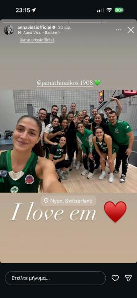 Η Άννα Βίσση ανάρτησε σε story στον λογαριασμό που διατηρεί στο Instagram, πανηγυρική φωτογραφία από την γυναικεία ομάδα μπάσκετ του Παναθηναϊκού, μετά το μεγάλο διπλό στην έδρα της Νιόν.«Τις αγαπώ», ανέφερε στο σχόλιό της η πασίγνωστη τραγουδίστρια, που δεν έχει κρύψει ποτέ τα αισθήματά της για τον Παναθηναϊκό, εκδηλώνοντας την αγάπη της με κάθε τρόπο.
