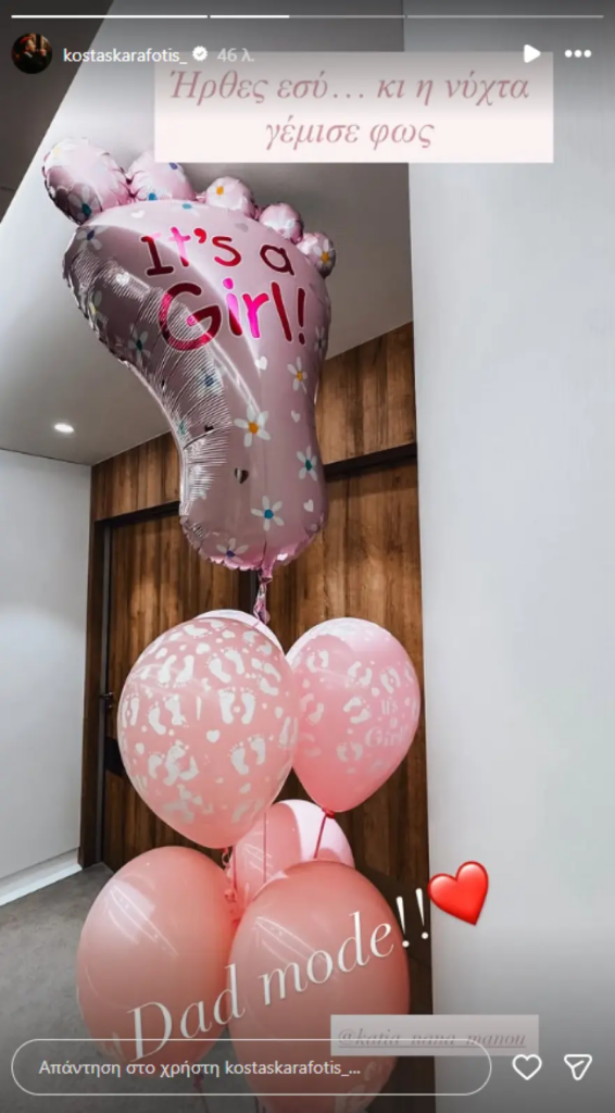 Γονείς για πρώτη φορά έγιναν ο Κώστας Καραφώτης και η σύζυγός του, Κάτια Μάνου, καθώς γεννήθηκε η κόρη τους.Την Τετάρτη 28 Ιανουαρίου, ο τραγουδιστής ανακοίνωσε την ευχάριστη είδηση μέσα από τον προσωπικό του λογαριασμό στο Instagram, δημοσιεύοντας μία φωτογραφία με ροζ μπαλόνια. Στο Instagram story του έγραψε χαρακτηριστικά «ήρθε εσύ και η νύχτα γέμισε φως» χρησιμοποιώντας στίχους από το κομμάτι του «Ήρθες εσύ».Η κόρη του Κώστα Καραφώτη και της Κάτιας Μάνου γεννήθηκε την Τρίτη, με τη σύζυγο του τραγουδιστή να δημοσιεύει ένα στιγμιότυπο στο Instagram σημειώνοντας: «27/1/26, ημέρα που θα θυμάμαι», ενώ σε άλλη φωτογραφία, που αναδημοσίευσε, εμφανίζεται χαμογελαστή στο μαιευτήριο.To ζευγάρι παντρεύτηκε τον Μάιο του 2024 στο Κολωνάκι. Στις 22 Νοεμβρίου, ο Κώστας Καραφώτης ανακοίνωσε ότι η σύζυγός του ήταν έγκυος λέγοντας στην κάμερα της εκπομπής «Καλύτερα δε Γίνεται»: «Νιώθω υπέροχα που θα γίνω πατέρας για πρώτη φορά. Θα είναι κοριτσάκι και είμαι διπλά χαρούμενος».