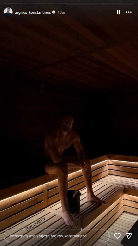 Σε σάουνα πόζαρε ο Κωνσταντίνος Αργυρός και δημοσίευσε τη φωτογραφία στον προσωπικό του λογαριασμό στο Instagram.Ο τραγουδιστής την Κυριακή 22 Φεβρουαρίου ανέβασε συγκεκριμένα ένα story στο προφίλ του, από τη στιγμή που χαλαρώνει μέσα σε μία σκοτεινή σάουνα, ημίγυμνος, κοιτάζοντας την κάμερα.Πάνω στη φωτογραφία έγραψε: «Ανάρρωση».Ο Κωνσταντίνος μοιράστηκε με τους ακόλουθούς του τον τρόπο που επέλεξε να ηρεμήσει και να ξεκουραστεί μετά από τις επαγγελματικές του υποχρεώσεις.