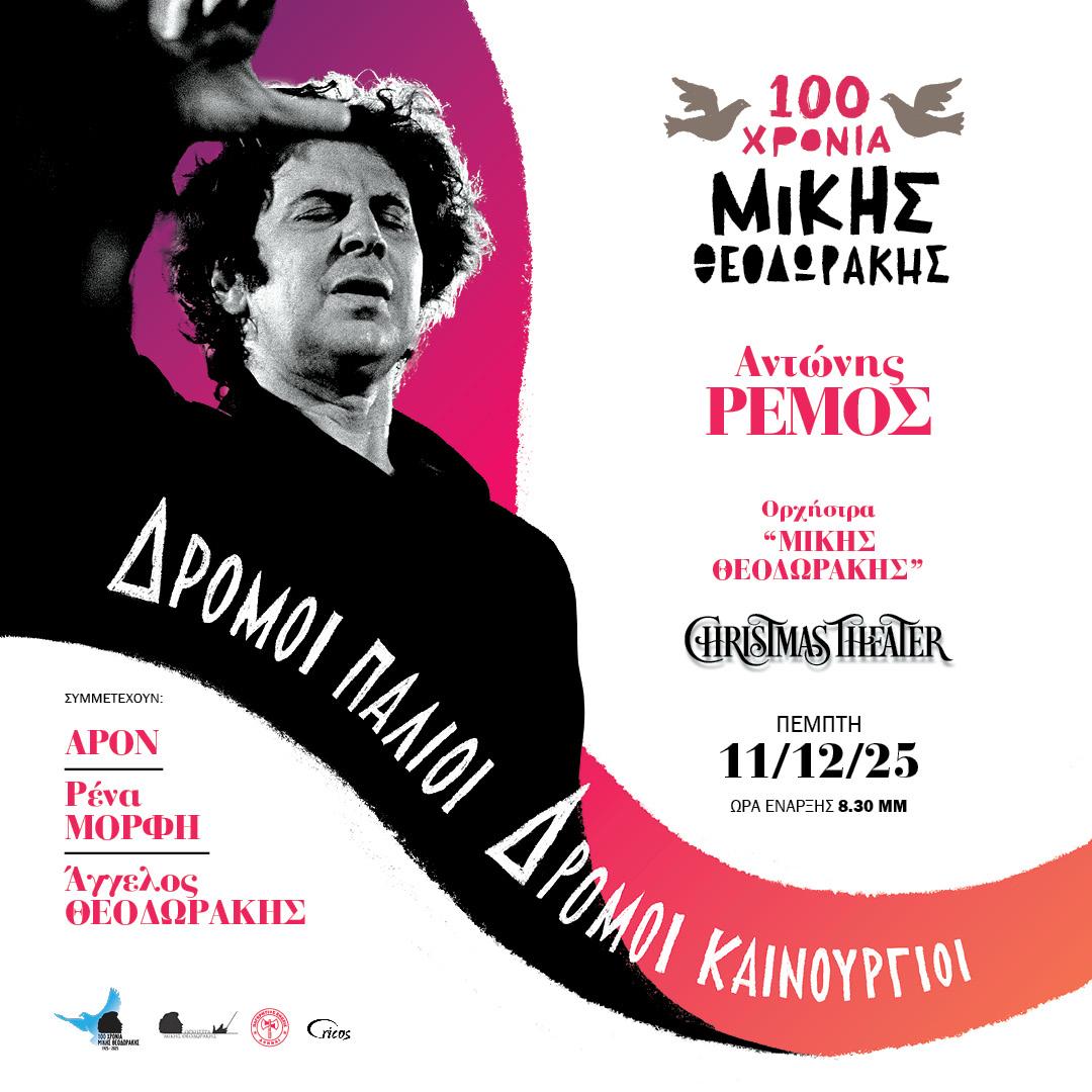 Ο Αντώνης Ρέμος «συναντά» τον Μίκη Θεοδωράκη σε μια μεγαλειώδη συναυλία με την οποία ολοκληρώνεται το «Αφιερωματικό Έτος Μίκη Θεοδωράκη» για τα 100 χρόνια από τη γέννησή του.Η συναυλία υπό τον τίτλο «Δρόμοι Παλιοί, Δρόμοι Καινούργιοι» θα διεξαχθεί την Πέμπτη 11 Δεκεμβρίου, στις 8:30 το βράδυ, στο Christmas Theater και θα αποτελέσει μια μυσταγωγική βραδιά – φόρο τιμής στον Έλληνα συνθέτη.Συμμετέχουν η Ορχήστρα «Μίκης Θεοδωράκης» με την καλλιτεχνική επιμέλεια της Μαργαρίτας Θεοδωράκη και οι ερμηνευτές Apon, Ρένα Μόρφη και Άγγελος Θεοδωράκης.Ο Μίκης Θεοδωράκης και ο Αντώνης Ρέμος έχουν συναντηθεί μουσικά και στο παρελθόν, τόσο σε συναυλίες της Ορχήστρας «Μίκης Θεοδωράκης», όσο και σε επανεκτελέσεις τραγουδιών του δημιουργού, αναπτύσσοντας παράλληλα μια αμοιβαία βαθιά σχέση.Ο Αντώνης Ρέμος, 20 χρόνια μετά την πρώτη του σύμπραξη με τον Μίκη Θεοδωράκη, θα φέρει στο προσκήνιο τις μνήμες και τα συναισθήματα, σε μια συναυλία που θα μεταλαμπαδεύσει το διαχρονικό και πολυδιάστατο έργο του στις νεότερες γενιές μέσα από μοναδικές εκτελέσεις και ερμηνείες.Στη συναυλία η Παγκρήτιος Ένωσις θα τιμήσει τον Μίκη Θεοδωράκη με το κρητικό χορευτικό συγκρότημα «Δικταίοι Καστρινοί» και τον χοροδιδάσκαλο Γιώργο Φραγκάκη να χορεύουν συμβολικά ένα εμβληματικό τραγούδι του.